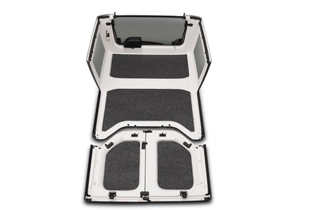 This 100% waterproof, fully custom die cut headliner kit installs quickly without the need to remove your hard top. The individual pieces can be quickly installed by removing the specially designed tape and pressing firmly into place. The BedRug material resists all harsh chemicals, and will not stain, stink, mold or mildew. The 1/2-inch polypropylene foam will help insulates your interior from road noise and heat.