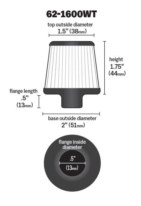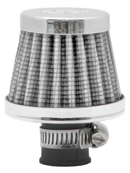 K&N crankcase vent filters are perfect for racing applications, vintage cars or individuals who want to add some aesthetics to their classic carbureted engine. The cone-shaped 62-1600WT crankcase vent filter has a K&N embossed chrome top and chrome base. The flange clamps directly onto a 3/8 to 1/2 inch metal or plastic tubing where venting is needed. Constructed with a white colored synthetic media it can be cleaned and reused repeatedly.
