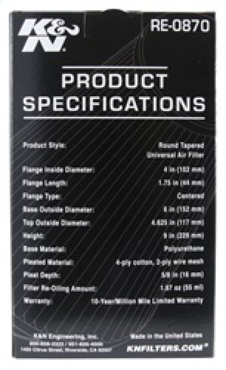 K&N Universal Rubber Filter 4inch FLG / 6inch OD-B / 4-5/8inch OD-T / 9inch H