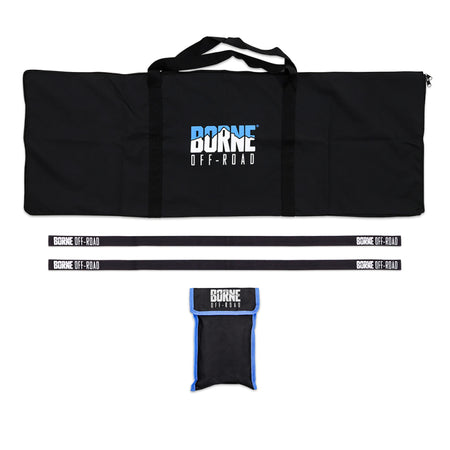 but you came prepared. You detach your Borne-Off Road traction boards, place them into position, acquire instant traction, and continue your journey up the trail. Our Borne Off-Road traction boards are an excellent addition to keep you out of trouble and moving along the trail. These traction boards are constructed from fiber-reinforced nylon, making them extremely durable but still flexible enough to conform to obstacles like roots and rocks. The boards' traction face features robust cleats that provide maximum grip in sand, mud, gravel, snow, rocks, and any terrain you find yourself crawling through. High-quality mounting hardware and brackets provide the option of mounting these on external areas of your vehicle for convenient access, while an included durable carry bag allows for storing the traction board kit inside your vehicle or home. The integrated handles along the sides make handling these boards easy and flipping them over reveals their secondary use as a shovel for clearing debris near your tires. Borne Off-Road traction boards can aid large off-road vehicles and feature a maximum load capacity of 10,000 lbs. per board. Our traction boards also include a pair of recovery leashes, which quickly locate buried boards after use. Borne Off-Road traction boards are available in a variety of colors to suit any style and, as with all our Borne Off-Road products, this traction board set includes or signature Lifetime Warranty.