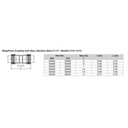 MegaPress 1-1/2" Stainless Steel 304 Coupling with Stop - Double Press Connection - Smart Connect Technology